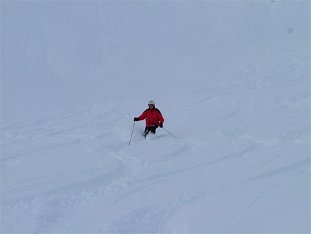 One disadvantage of going last is that it’s a bit harder (but not much) get fresh tracks. On the other hand, you have the whole slope to yourself, as Avrum does in this shot.