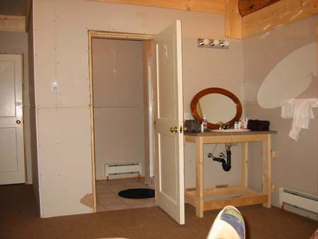 Each guest room includes a private bath, which includes a john and a shower in the inner room. This photo was taken from my bed (notice the foot). The baseboard heating is radiant heating via a gycol-water mix. It was quite comfortable. My biggest complaint—because I’m 6’2” tall—is they didn’t mount the mirror on the wall.