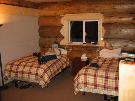 Vertebrae Lodge holds 24 guests, the bar, and the dining room. Solitude Lodge hold 12 guests, staff, and the drying room. Gene and I shared this room in Solitude, which is typical of the guest rooms in both lodges. The furnishings are spare, but very comfortable. That’s a heating pad Gene is holding over his face; go figure.