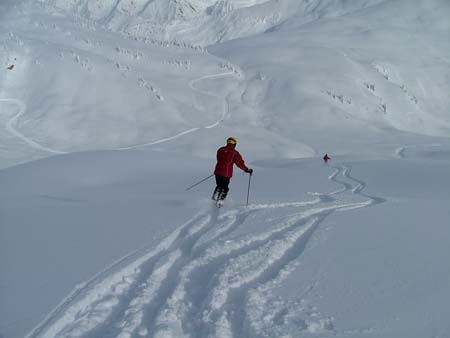 I was the third skier down this pitch, which included a slighly steeper section at the bottom. Andrew is out of sight. On this day, we got fresh tracks in 8-12" of new snow, and the visibility was terrific. You can see the cat road off in the distance. With this kind of scenery, it was easy to get distracted while skiing.