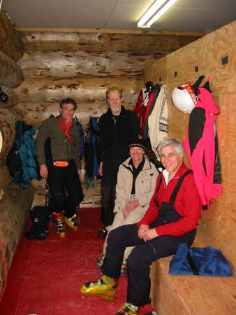 Almost the entire first floor of Solitude Lodge was devoted to the drying room. The bench on which Joni and Avrum are sitting has vents for forced air, which permeated the entire room. We left our boots, gloves, helmets, and other outerwear on hooks (i.e., nails) to dry slowly overnight. Not as fancy as the season lockers at Sun Valley, but very effective. (This photo was taken on our last day of skiing.)