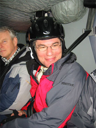 Alpine Helicopters has two machines: the old Bell 212 seats 12 and the newer, quieter Bell 207 seats 6. We rode in the 212 both ways, and it’s a bit cramped. Felt like the helicopters you see in Vietnam movies. I sat next to a window facing towards the tail, and Gene was to my left across the “aisle” facing forward. Brian, who ended up in our cat group, is next to Gene.