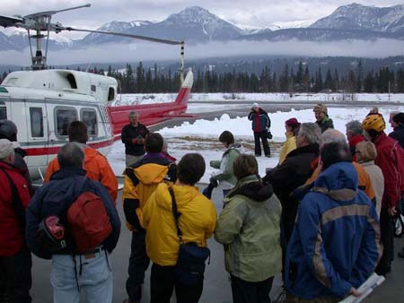 We started at Alpine Helicopters at the airport in Golden, BC. They have two helicopters and each makes two trips into Chatter Creek. Before the flight, the pilot talks about safety, how to get in/out of the helicopters, and what to do if something goes wrong. He also notes that the first two flights are the only time we'll be boarding the machines without the blades rotating.