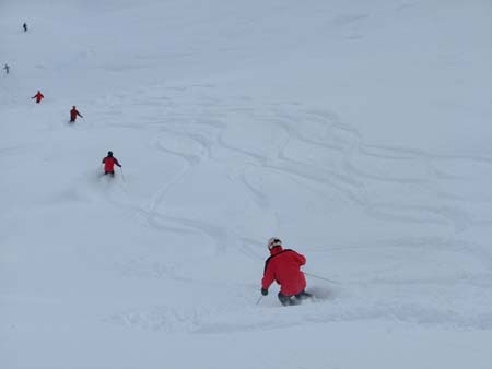 A lot of the skiing was on relatively low-angle slopes like the one in this photo. We did do some steep pitches almost every day; on one occasion, Andrew skied ahead, over a lip and out of sight. Will asked us to guess the angle of the slope. I chimed in with 28 deg. at which point Will whipped out a high-tech inclinometer and measured the top half of the slope at 33 deg. at the bottom half at perhaps 38 deg. It was a great run, and I must have one of those inclinometers. (I played with it after skiing that day.)