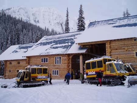 The three Bombardier snow cats were loaded and left by 8:45am each morning (except the first morning, when we spent 45 mins. or so on avalanche transceiver exercises). Each cat holds 12 guests, 2 guides, and 1 driver. The cats were stocked with delicious sandwiches, cookies, fruit, etc. for each group; we ate lunch in the cat on the rides up to the drop-off points.