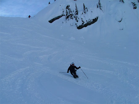 Most of our skiing was above the treeline, because the snow was best there. It had rained at the lodge and a bit higher the week before we arrived, so most of the tree skiing was too crunchy. In this photo, Murray’s cruising down a pitch on the way to a run in the trees that featured an open creek hazard. Murray was the luckiest member of our group—he stayed for a second, 3-day tour because there were last-minute openings at half price.