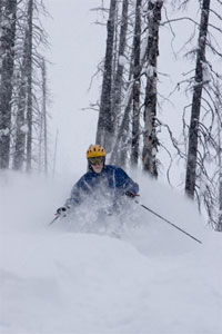 There were lots of snow pillows, like the one I’m blasting through in the left photo. Stumps lurked in some of these, and a few of us (me included) got treated to somersaults. The second and third photos are in our favorite runs, Spruce Slide and Enchanted Forest.