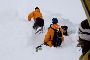 Our snowboarders, Mark and Justin, did not enjoy the numerous traverses (often through trees) and runouts. While we sympathized with them, Mark’s mishaps provided some entertainment.