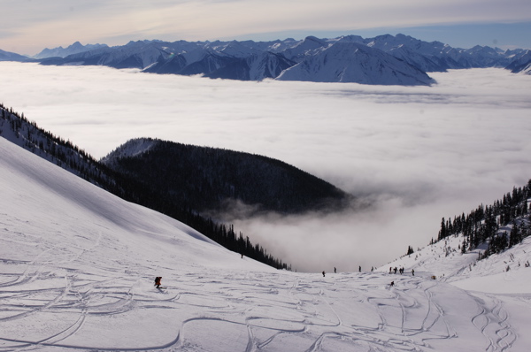 The usual spectacular scenery. We’ve just skied down into the Oyster Bowl towards Kinbasket Lake, hidden below the clouds.