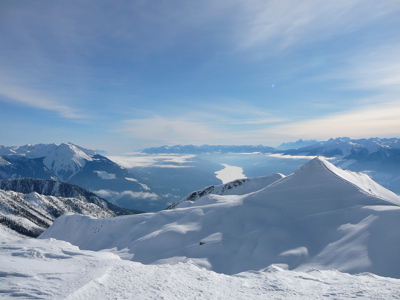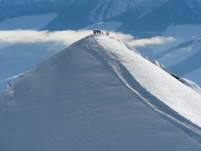We did a 10-minute hike up this knoll in order to get the long, untracked run shown on the next page. More terrific scenery. This group isn’t us; it’s the group that skied the run after us. But you get the idea...