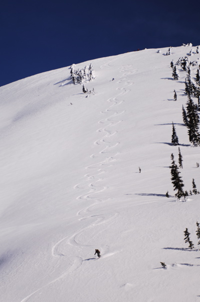 Yeehaw! From the top of the knoll, it was untracked powder on a long, constant-pitch run for everyone. Les is front, and I’m near the top. We wanted to do this again, but never got back to it, partly because this day was the only one with good visibility in the alpine.
