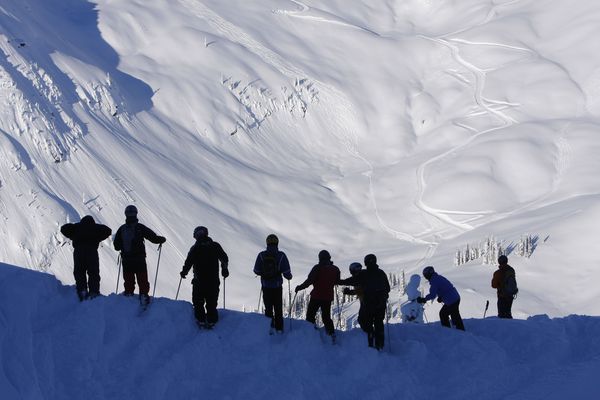 We’re lined up peering over the ridge on one of our runs in the Oyster Bowl. Note the tracks on the other side of the bowl; these are ours or from one of the other cats.