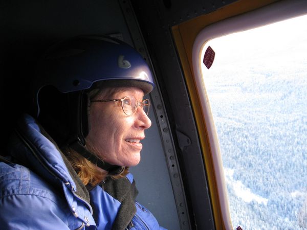Maylee peers out of the side window on the helicopter ride into Chatter Creek. On the flight out, she rode shotgun by the pilot.